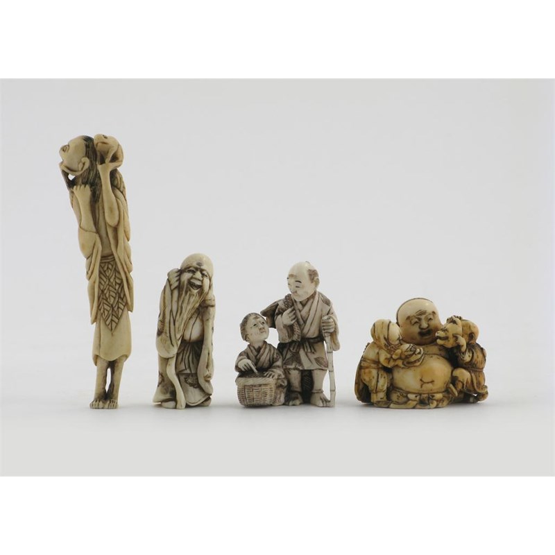 Four small Japanese ivory carvings, depicting various figures, two with inscriptions, 19th century, 8.5cm. (4)