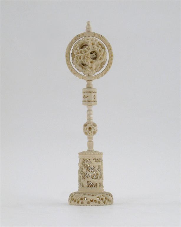 A Chinese carved ivory puzzle ball, mounted in an elaborate reticulated stand, 2nd half 19th century, 30cm overall, the ball 6cm dia.