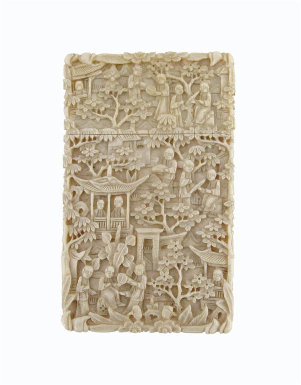 A Chinese ivory card case and cover, carved with figures in pagodas amidst trees, 19th century, 9.6cm. (2)