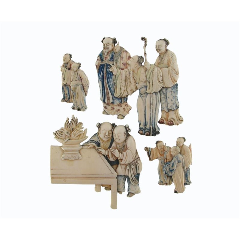 Four Chinese ivory appliqués, carved as groups of figures, one as two boys at a table with a bowl of finger citron, with traces of coloured pigment, 18th/19th century, 10cm max. (4)