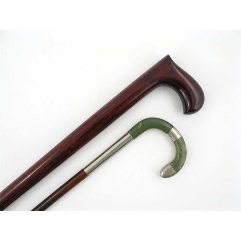Two walking canes, one inlaid in silver with numerous shou characters, the other with a jade handle, c.1900, 92cm max. (2)