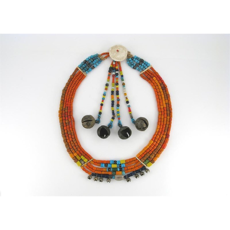 A tribal necklace or belt, from Nagaland, India, constructed from colourful glass beads and bells, 19th/20th century, 50cm approx.