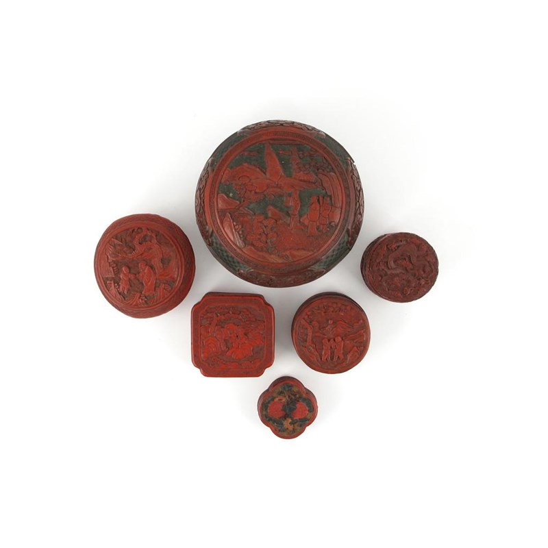 Six Chinese cinnabar lacquer boxes and covers, four carved with figures in rocky landscapes, one with fruit and flowers and one with carved with scaly dragons amidst cloud scrolls, 19th century, all with damages, 20cm max. (12)