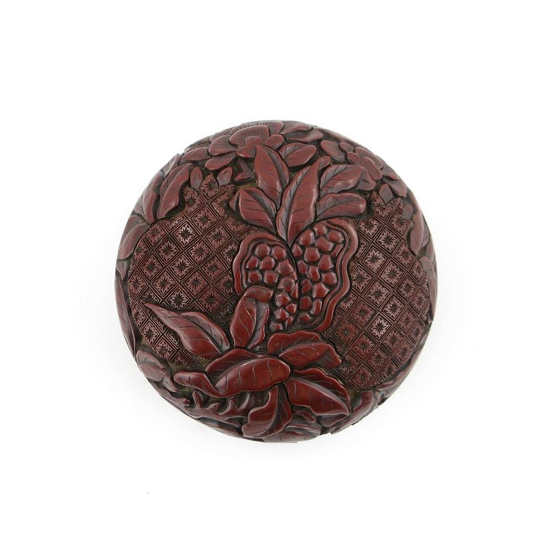 A Chinese red cinnabar lacquer circular box and cover, carved with pomegranates and flowers, 19th/20th century, rim chips, 8cm. (2)