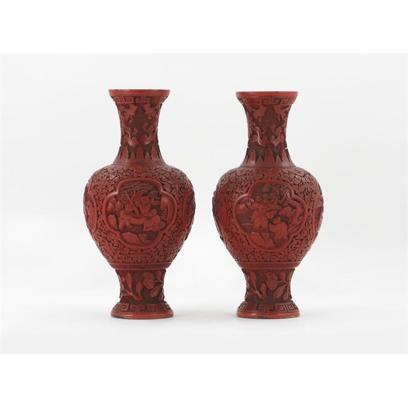 A pair of Chinese red cinnabar lacquer vases, each decorated with four quatrefoil panels of figures on a ground of flowers and foliage, 19th century, restoration to the rims, 25.4cm. (2)