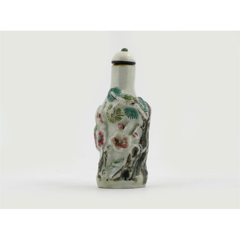 A Chinese porcelain scent bottle, modelled with prunus and pine tree encircling a bamboo trunk, painted in famille rose enamels, 18th century, 8cm.