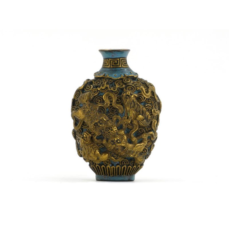 A Chinese porcelain snuff bottle, heavily moulded with nine Buddhistic lion dogs chasing brocade balls and heightened in gilt on a lavender ground, unmarked, probably 19th century, one tiny surface chip, 7.5cm.