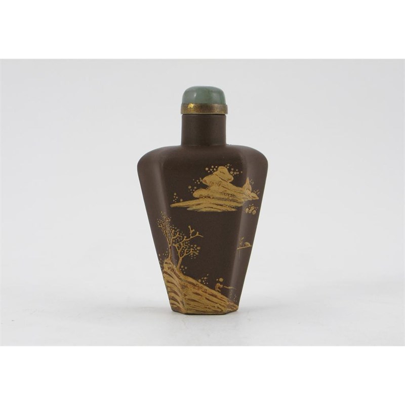 A Chinese Yixing stoneware hexagonal snuff bottle, decorated in paler slip of small figures in a watery landscape and with a prunus spray to the reverse, the base with an indistinct seal mark, 6.7cm.