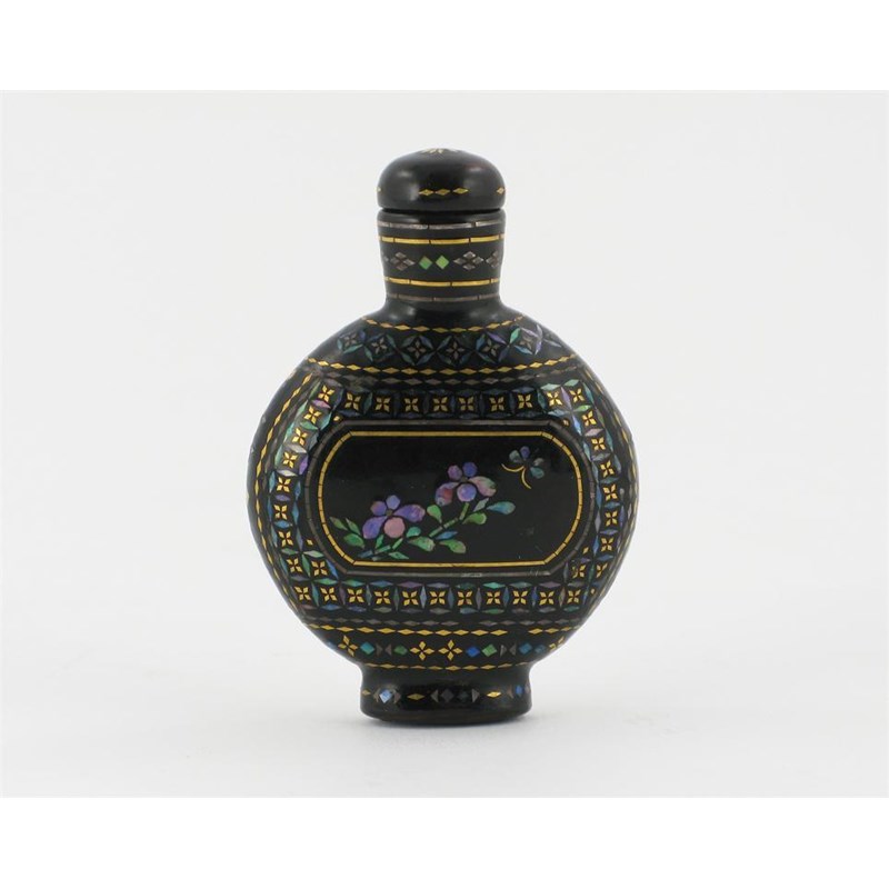 A lacque burgauté snuff bottle and stopper, each side decorated with a flower spray on a diaper ground, 18th/19th century, 5.6cm. Together with a hardwood stand. (2)