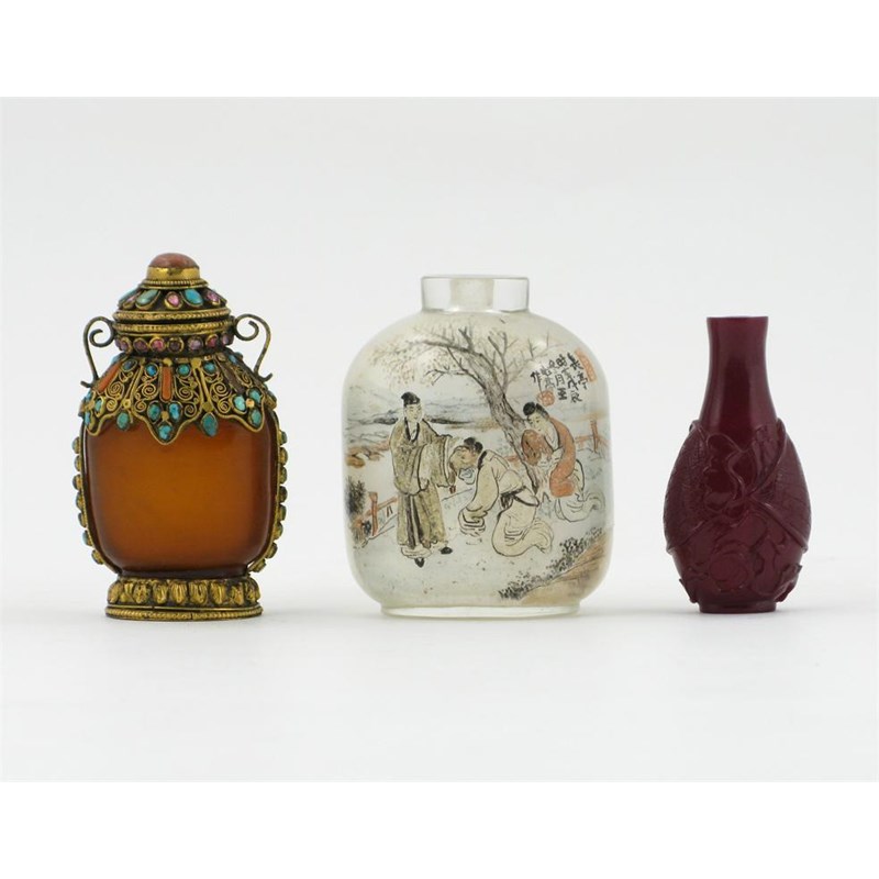 Two Chinese snuff bottles, one cranberry coloured glass carved with a tied sash, the other interior painted with six figures and calligraphy and Mongolian set with turquoise, coral and gilt metal, 19th/20th century, 8.5cm. (3)