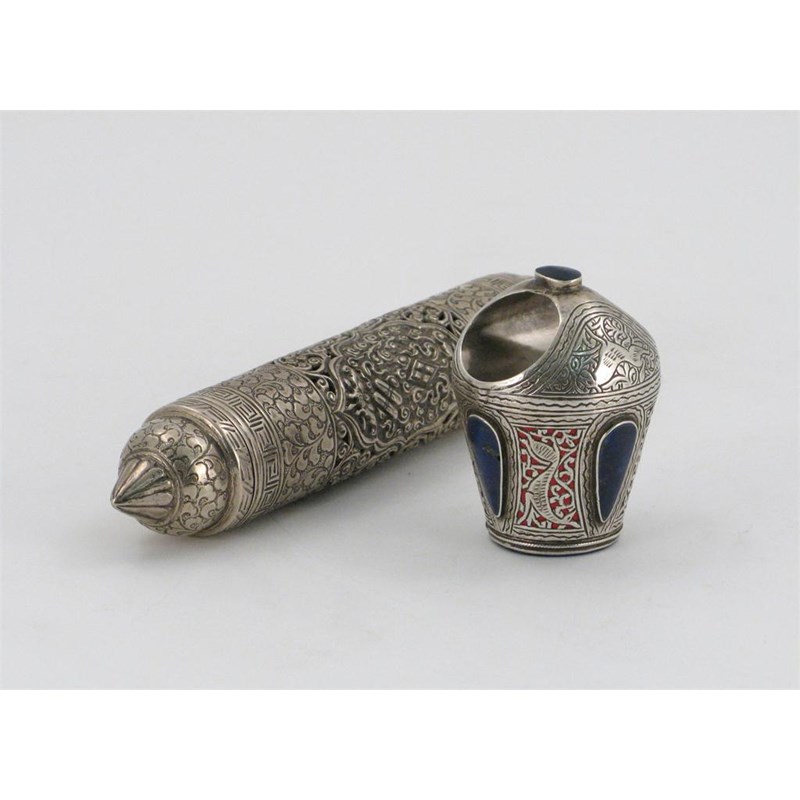 A silver coloured metal scroll case, probably Indian, decorated with a repoussé panel on a reticulated ground, together with a lapis seal, depicting a sinuous deer with a silver coloured metal and lapis mount, 19th/20th century. 20.5cm max. (3)