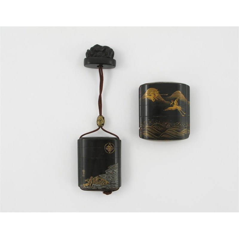 Two Japanese black and gold lacquer inro, one decorated with a figure with a scroll on a minogame, the other with a warrior fighting an oni, signed to the reverse, 18th/19th century, 7cm max. (2)