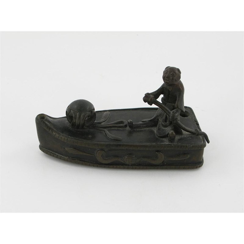 A small Chinese bronze water dropper, formed as a small boat paddled by a seated figure, probably 17th century, 9.5cm.
