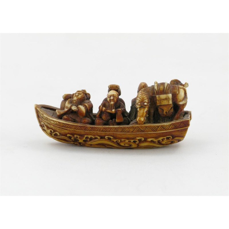 A small Japanese ivory carving of five figures and horse, riding in a small boat, the base carved with breaking waves and with a two character mark, 19th century, small surface chips, 7.2cm.