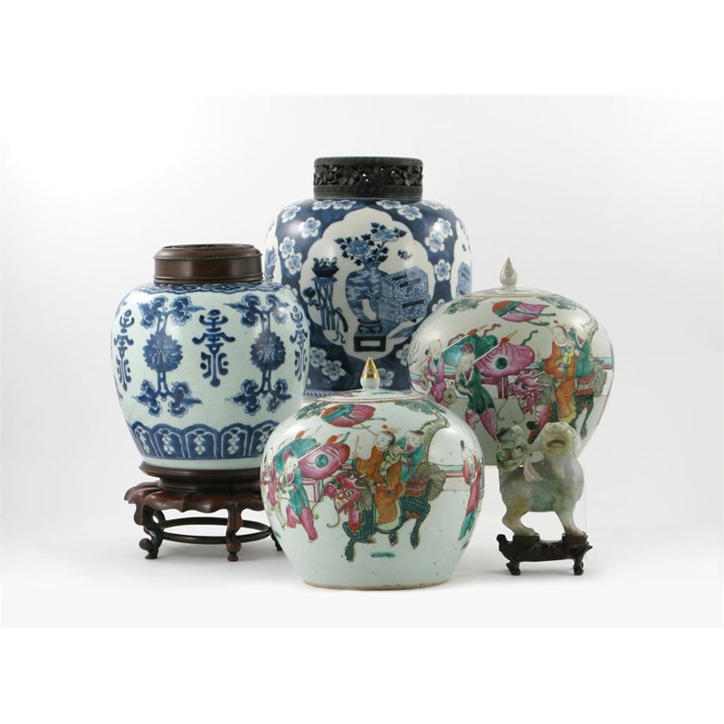 Four Chinese porcelain ovoid vases, two blue and white with wood covers and two famille rose with porcelain lids, together with a hardstone mythical beast and two wood stands, 18th century and later, 29cm max. (11)