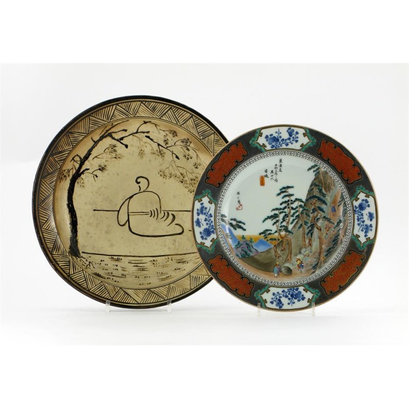 A Japanese Seto ware dish, decorated with a figure sitting beneath a tree, and a modern Japanese porcelain dish painted with figures on a mountain road beneath pine trees, both damaged, 27cm max. (2)