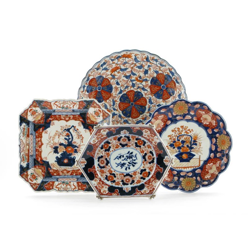 A collection of Japanese Imari porcelain dishes, typically decorated with vases, flowers, fans, birds and other designs, all circa 1900, 41.5cm max. (15)