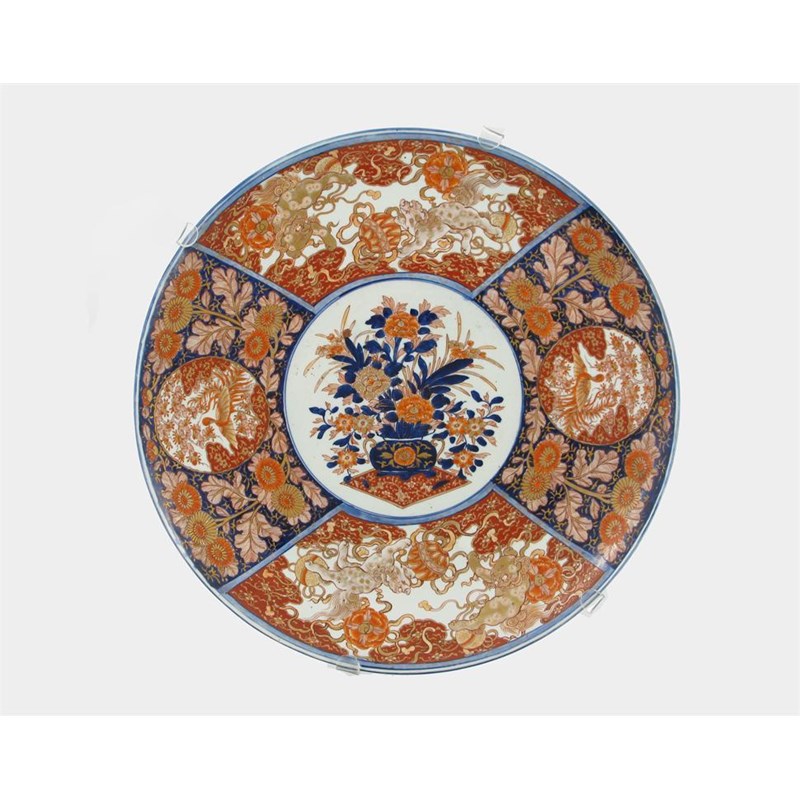 A massive Japanese Imari dish, painted with panels of lion dogs and phoenix around a central floral medallion, 19th century, 61.5cm.