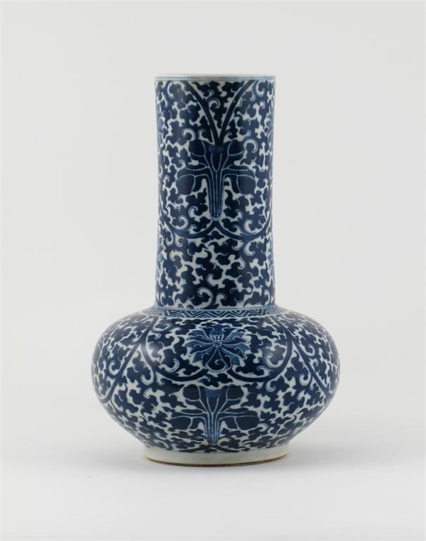 A Chinese blue and white vase, with a cylindrical neck and a compressed circular body, decorated with a lotus scroll, flower heads and leaves, the base with a six character Kangxi mark, but 19th century, 33cm.