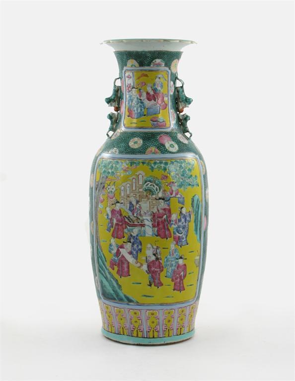 An unusual Chinese famille rose vase, painted with yellow panels of figures on a green ground to simulate shagreen, 19th century, some good restoration, 62cm.