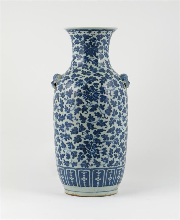 A Chinese blue and white vase, with lion mask handles to the shoulder the body decorated with a leaf and flower scroll design, unmarked, 19th century, 45.5cm.