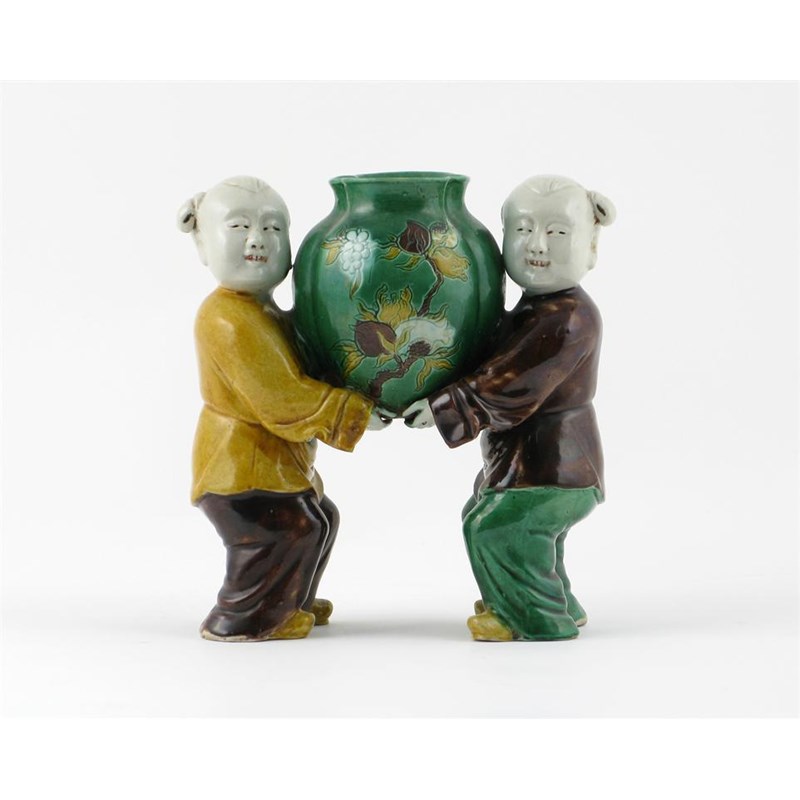 A Chinese model of two boys, holding a large green vase decorated with an incised fruiting branch, glazed in yellow, brown and green, 19th century, 19cm.