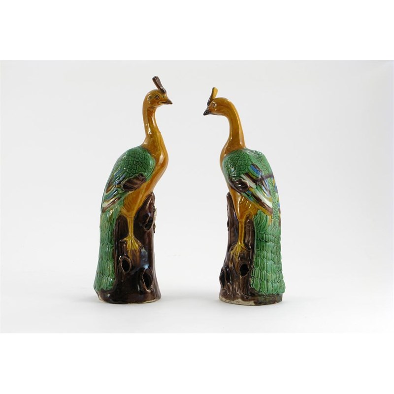 A pair of Chinese polychrome models of peacocks, one comb repaired, 26cm. (2)