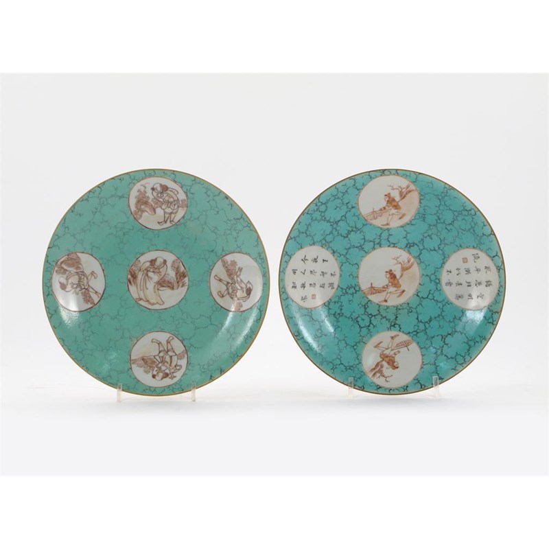 Two Chinese turquoise ground dishes, painted with circular panels containing European figures and calligraphy, each with a Qianlong six character mark and perhaps late in the period, 20.2cm. (2)