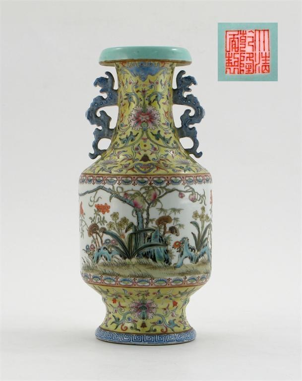 A Chinese famille rose vase, the cylindrical body finely painted with a fruiting peach tree above rockwork, lingzi and flowers, the neck and foot decorated with stylized flowers on a yellow ground, the handle as mythical beasts, the base with an iron red six character Qianlong mark, but later, 27.3cm.