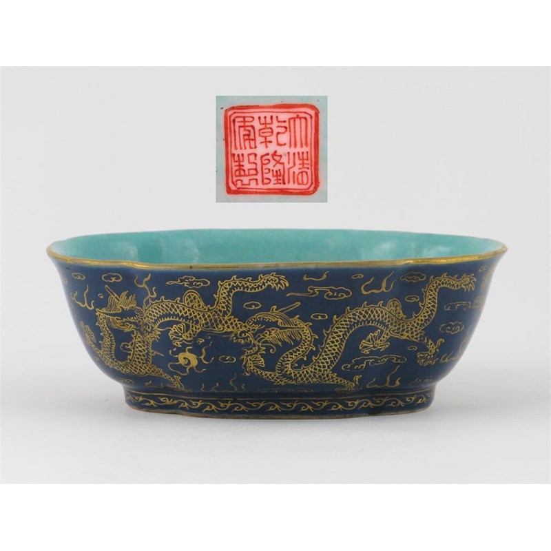 A Chinese quatrefoil dragon bowl, the exterior painted in gilt with five scaly dragons contesting pearls of wisdom on a blue ground, the interior turquoise, the base with an iron red six character Qianlong seal mark, but 19th century, 20.9cm.