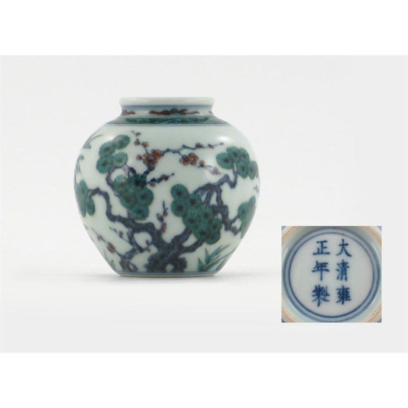 A Chinese doucai ovoid vase, painted with the Three Friends of Winter, a six character Yongzheng mark but modern, 8cm.