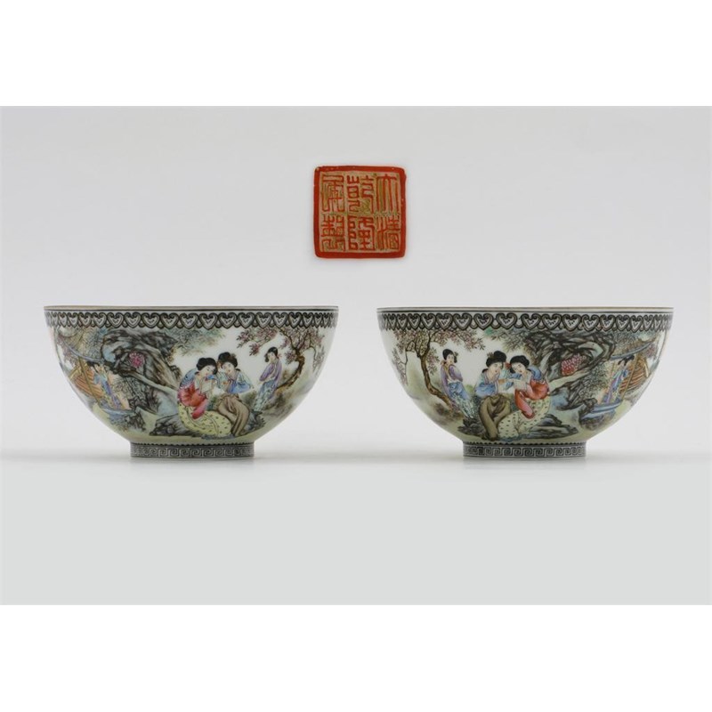A pair of Chinese eggshell porcelain bowls, each painted with young ladies in gardens and with calligraphy to the reverse, each with a six character Qianlong seal mark but 20th century, 12.8cm. (2)