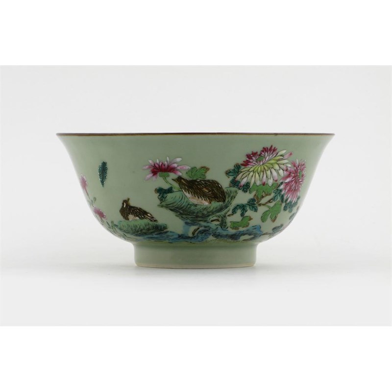 A Chinese celadon ground bowl, with a flared rim, painted with two quail amidst rockwork and chrysanthemum and with two bats to the reverse, the interior with three further bats, the base with a six character Qianlong seal mark and probably late in the period, 17.8cm.