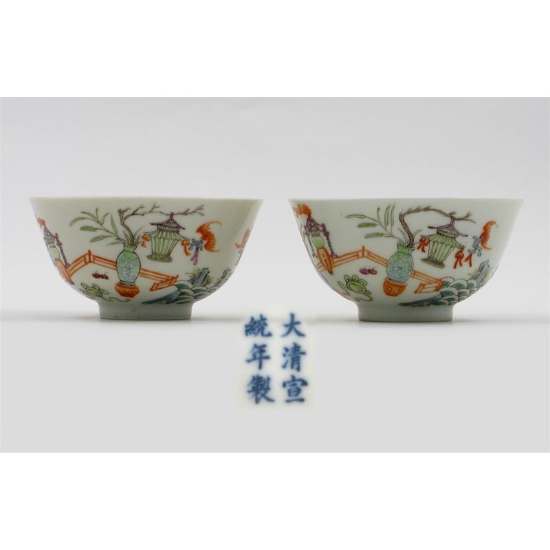 A pair of Chinese famille rose bowls, painted with Chinese lanterns and vases on terraces and with bats and flyfot, six character Xuantong and perhaps of the period, 10.5cm. (2)