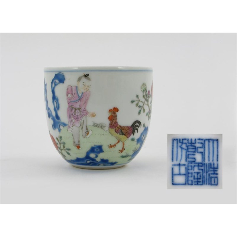 A Chinese famille rose U-shaped cup, painted with a boy in a garden with a large chicken between blue rock work and flowers, the reverse with seventeen rows of calligraphy, the base with a six character Qianlong mark, but later, 8.1cm wide.