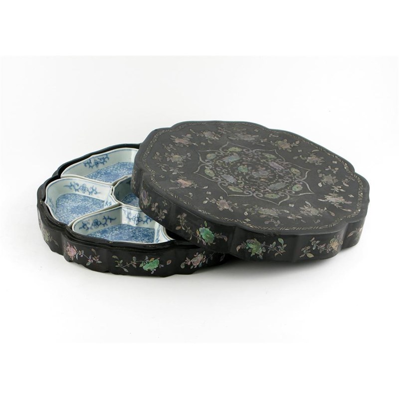 A Chinese blue and white supper set, painted with scrolling lotus, contained in a fitted black lacquer box, which is inset with mother of pearl with flowering and fruiting branches, 18th / early 19th century, damages, 30.5cm. (9)