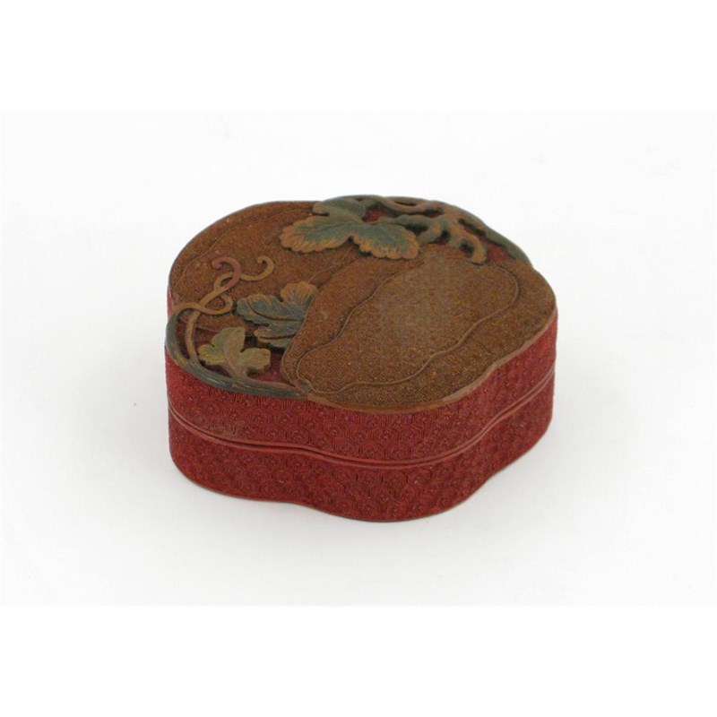 An unusual Chinese red cinnabar lacquer box and cover, the lid decorated in brown and green with two large melons or gourds, issuing from leafy stems, the sides with complex hexagonal diaper designs, 18th century, wear and chips to the flange, 11.8cm. (2)