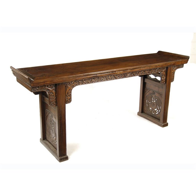 A Chinese nanmu (elm) altar table, with scrolling ends, the frieze carved in relief with stylized dragons and lingzhi, both ends enclosing an openwork candle on an open-winged crane holding a fungus in its beak, Shanxi Province 1850-1900, 207cm long x 90.1cm high x 53cm deep.
