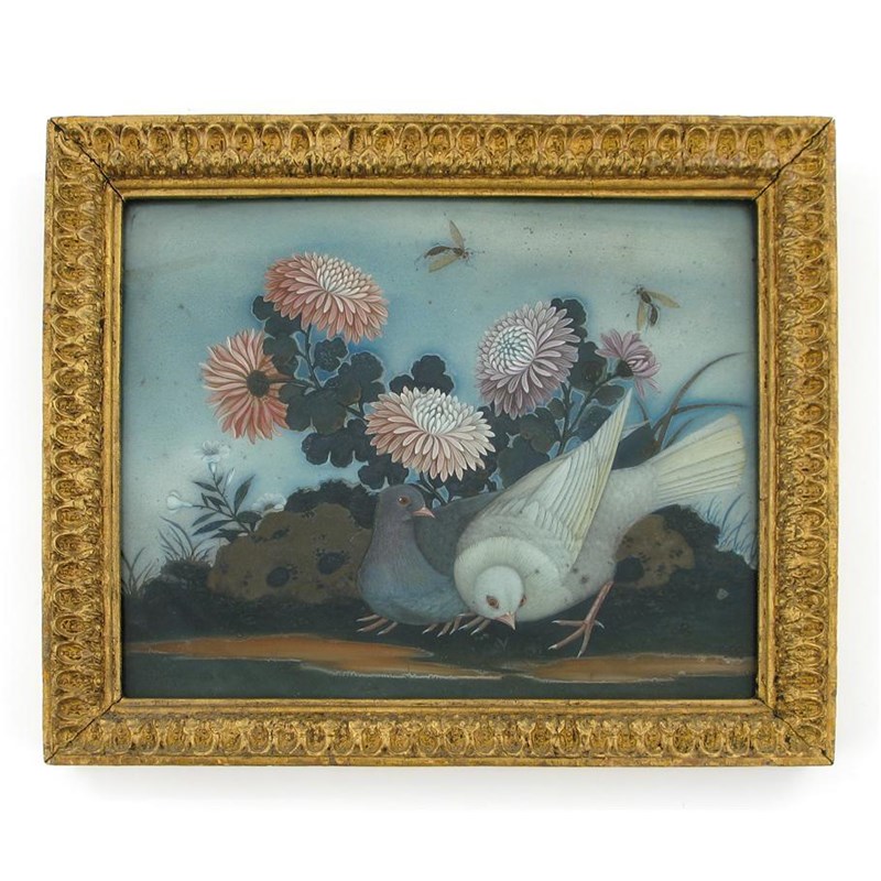 A Chinese reverse glass painting, depicting two doves at the water's edge before rockwork and chrysanthemums, and with two wasps in flight, 18th century, 23.5 x 29cm. Contained in a giltwood frame.