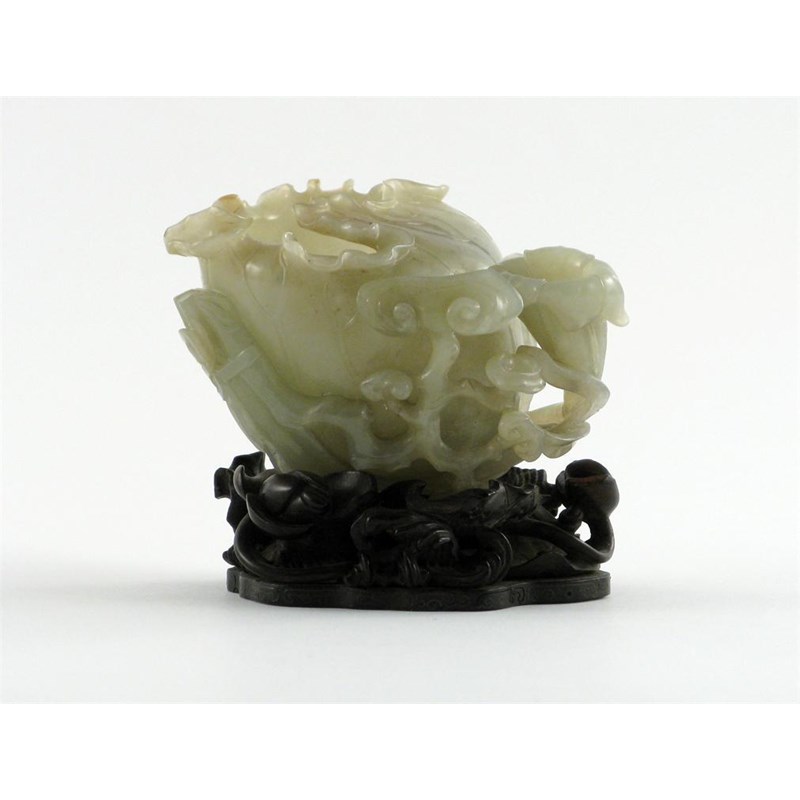A Chinese celadon jade brush washer, carved as a large lotus leaf, around which are tied further flower heads, leaves and a lingzhi fungus, 18th/19th century, together with an elaborate hardwood stand carved with lotus leaves and flowers on a base inlaid with silver wire, 10cm. (2)
