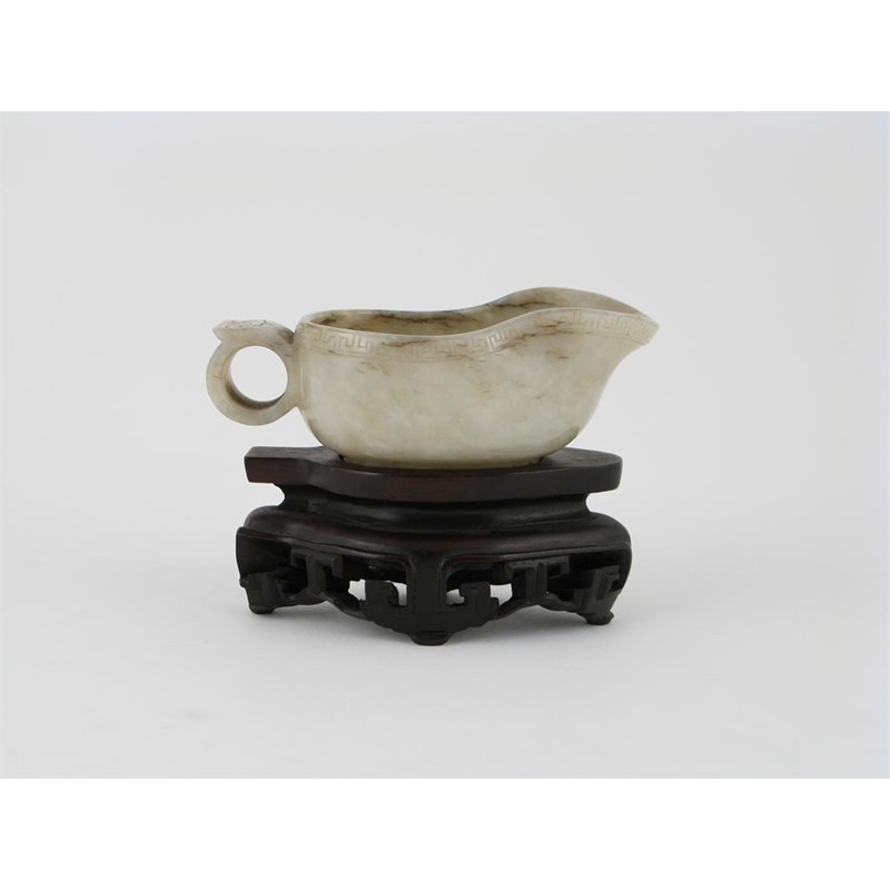 A small Chinese jade libation cup, the border carved with a band of key fret and inscribed to the side with a two character mark, perhaps for Zi Gang, probably 17th century, 8.9cm. Together with a wood stand. (2)