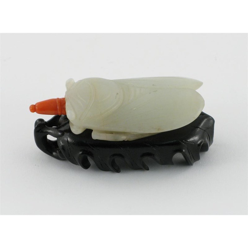 A Chinese pale celadon jade carving of a cicada, with a coral stopper, probably 19th century, together with a hard wood stand formed as a leaf with serrated edges, 6.4cm. (2)