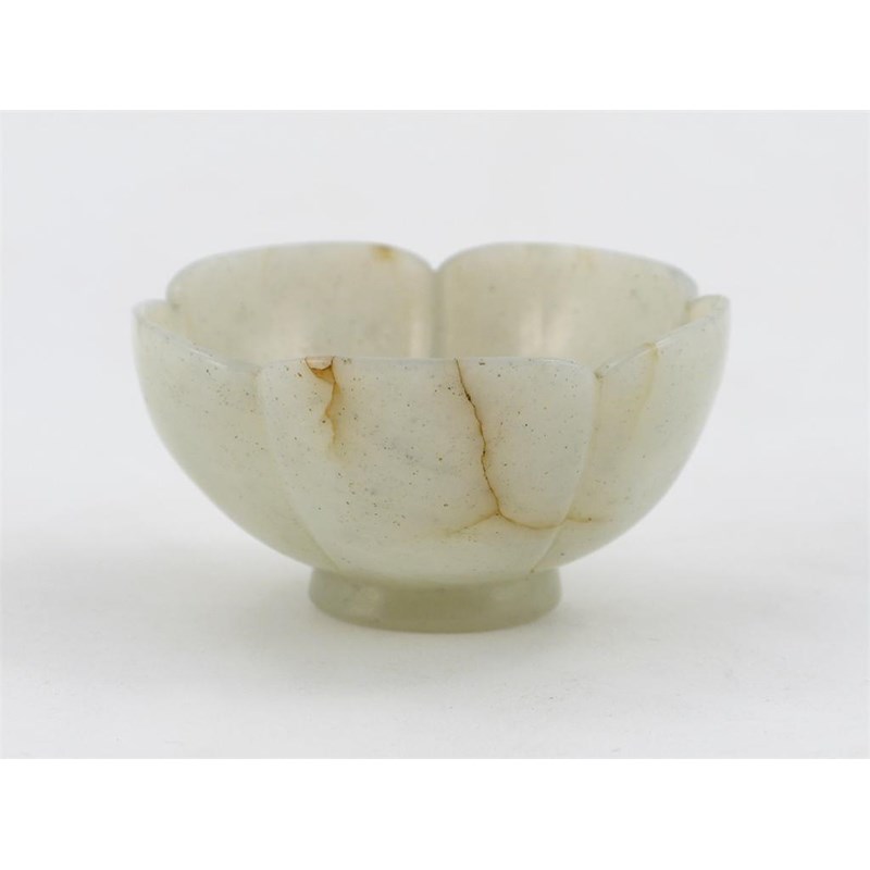 A small Chinese jade mallow-shaped bowl, the five petals rising from a short foot, probably early 19th century, 6.6cm.