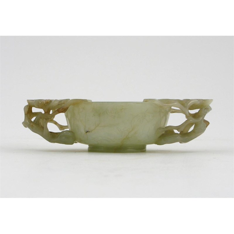 A Chinese celadon jade two handled cup, with a rounded bowl carved on one side in shallow relief with a single figure amidst bamboo and rockwork, the reverse with four lines of calligraphy and raised on a short straight footrim. The two handles pierced and worked in the form of gnarled prunus branches, each with a single blossom, Ming dynasty, 16th/17th century, 14cm.