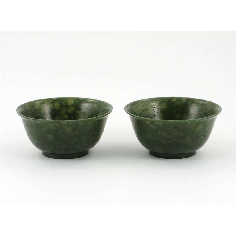 A pair of Chinese spinach jade bowls, with gently flared rims, the jade flecked with various shades, 18th century, 15.2cm. (2)