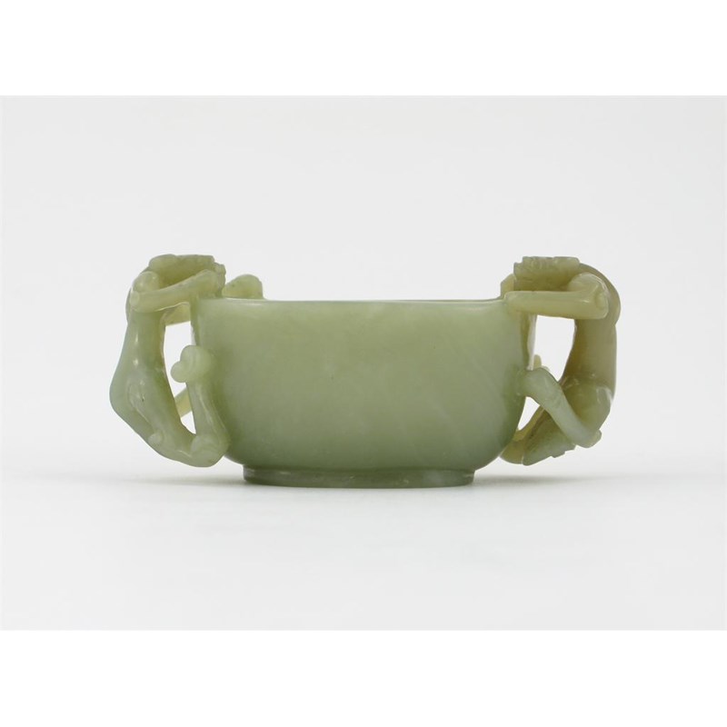 A Chinese yellowy green jade oval cup, carved at the end in high relief with chilong dragons with bifid tails, which hold the rim, 17th/18th century, 9.5cm wide.