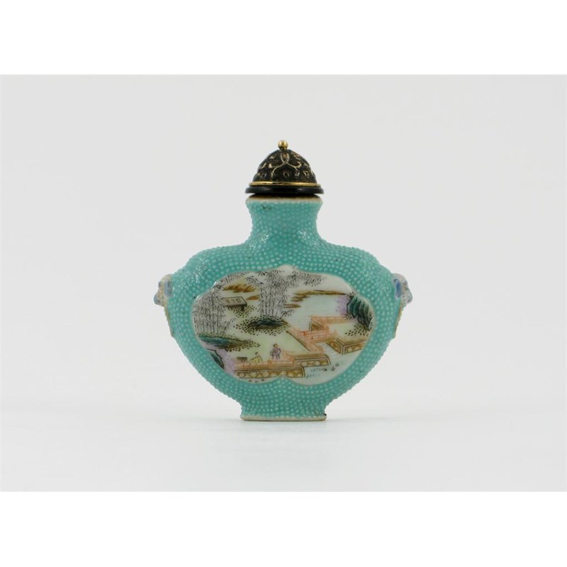 A small Chinese famille rose chicken skin ground snuff bottle, with animal mask and ring handles, one side decorated with figures in a river landscape, the reverse with four columns of calligraphy and a seal, the base with a blue enamel four character Qianlong mark and possibly of the period, 5.6cm.