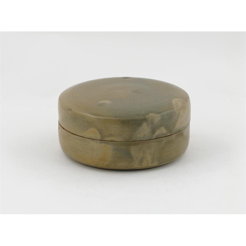 A Chinese yue ware cylindrical box and cover, the top of the cover incised with a lotus flower, the vessel covered inside and out with crackled celadon glaze, 10th century, 17.2cm dia. (2)
