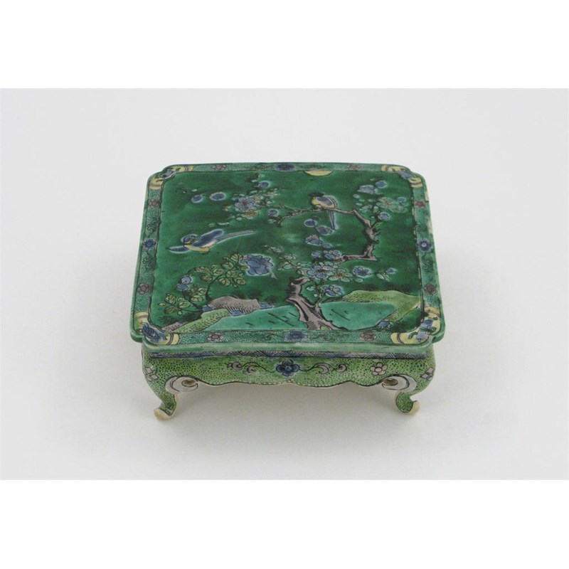 A Chinese famille verte stand, decorated with two song birds and a prunus tree growing from a rocky ledge, the apron moulded with rows of studs and raised on four scroll feet, Kangxi 1662-1722, restoration to the feet, 20.2cm.