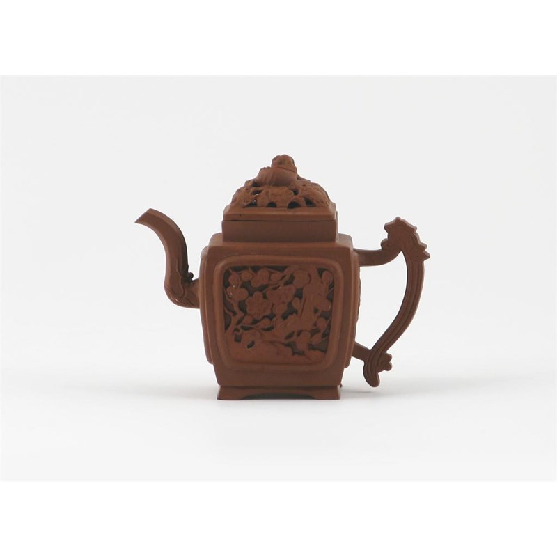 A Chinese Yixing brown stoneware teapot and cover, with a square section body modelled with panels of prunus, the reticulated cover surmounted by a mythical beast with a bifid tail, 18th century, 10.9cm. (2)